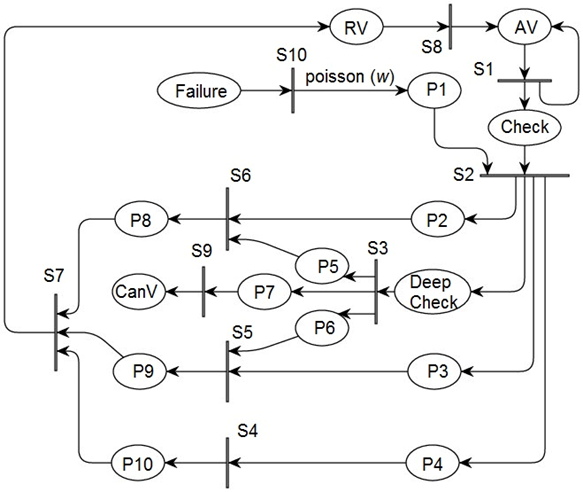 reserve vehicles; S1–S10 – transitions; Р1–Р8 – places of transition firing conditions; place Failure simulates the occurrence of a failure; poisson – is the arc expression when setting the Poisson failure law; place Check is a condition of a standard vehicle check; place Deep Check – a condition for a detailed check; place CanV contains cannibalized vehicles [11]