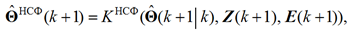 где KНСФ – нелинейная передаточная вектор-функция, эквивалентная коэффициенту усиления фильтра Калмана; Z(k + 1) – вектор-столбец, содержащий текущее наблюдение за значениями ПЗ КВР на (k + 1)-м шаге оперативного анализа защищенности, а также набор их значений с предыдущих шагов; E(k + 1) – вектор-столбец, содержащий текущую невязку АГФ на (k + 1)-м шаге, а также набор значений невязки с предыдущих шагов.