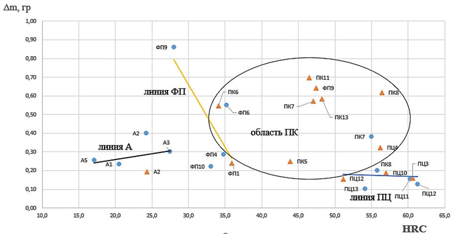 Аустенитная структура образцов в парах 1, 2, 3, 5, не получая упрочнение деформации и оставаясь стабильной, незначительно повышает износ ∆m (линия А) с увеличением твердости. Феррито-перлитная структура (линия ФП) при снижении твердости радикально изменяет поведение в сторону резкого увеличения износа в незначительном интервале. Стабильное снижение износа наблюдается в перлито-цементитной структуре (линия ПЦ), где увеличение твердости с 50 до 60 HRC повышает износостойкость. Перлито-карбидная структура показала неустойчивую зависимость от влияния твердости (область ПК) на износ, сохраняя в основном высокие значения массового износа.