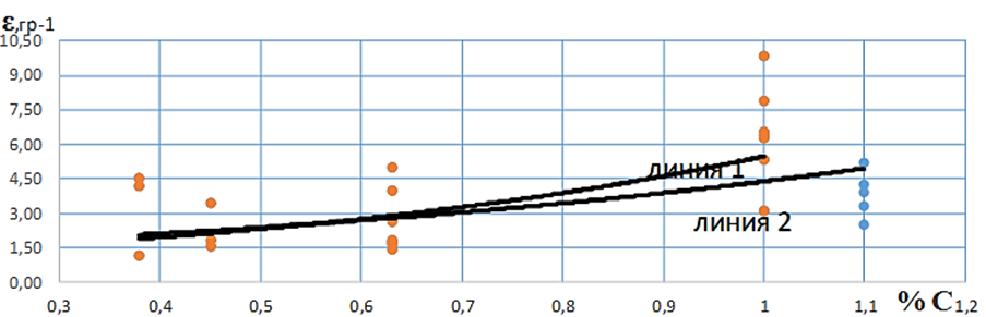 Твердость не оказывает влияние на изменение износостойких характеристик при повышении содержания углерода без упрочняющей термообработки [11]. Согласно графику существенное повышение износостойкости связано с изменением структуры, обусловленным полиморфными превращениями при высоком содержании углерода. Образцы в парах 3, 10–13 с цементованными поверхностями показали самую высокую износостойкость (линия 1), тогда как образцы с аустенитной структурой изменяют общую зависимость (линия 2) к снижению износостойкости. Высокое содержание углерода С в аустенитной матрице (1,1 %) не реализуется повышением твердости из-за низких упрочняющих нагрузок и образованию λ-фазы мартенсита деформации.