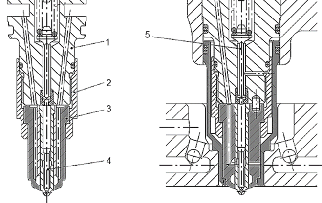 1 – корпус форсунки; 2 – гайка форсунки; 3 – распылитель; 4 – игла; 5 – стержень