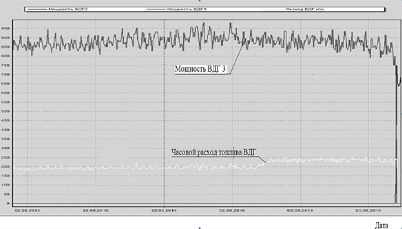 Система, установленная на судне, предоставляет информацию по ВДГ на судовой компьютер и в головной офис компании. На рис. 3 приведен скриншот с экрана монитора SSV – Vessel Complex, снятый в береговом офисе на основе накопленных исторических данных за выбранный промежуток времени. Информация доступна в табличном, числовом формате, а также в виде различных графиков. На данном примере для удобства рассматривается графическое отображение параметров. Согласно графику часового расхода топлива ВДГ (рис. 3) он увеличился в конце суток 02.08.2015, при том что мощность ВДГ не увеличилась и даже немного снизилась. Если более детально, то в течение 22 ч при той же средней мощности в 867 кВт часовой расход топлива составил 226,10 кг/ч против 189,3 кг/ч двумя часами ранее. Соответственно графику увеличение расхода топлива произошло в вечерний период, примерно с 20 до 22 ч по судовому времени. В итоге часовой расход топлива возрос на 36,8 кг/ч, или на 19,4 % от среднего значения расхода топлива на работу этого же дизель-генератора до момента начала описываемых изменений.