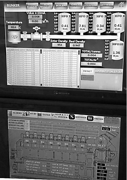Система включает в себя расходомеры, датчики температуры, оборотов, мощности, давления, GPS-станцию, преобразователи, контроллеры, судовой компьютер промышленного исполнения, панели для отражения параметров в центральном посту управления (ЦПУ) и на мостике, специализированное программное обеспечение для судна и офиса.
