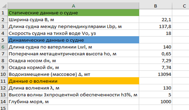 Решение данной задачи осуществляется в два этапа: ввод данных в таблицу и оценка опасностей плавания на определенных курсовых углах волнения. Ввод данных представлен на рис. 3.