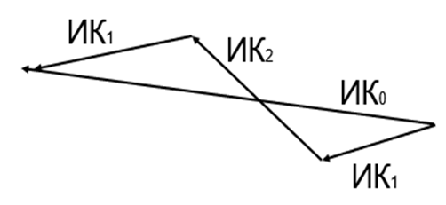 4. Изменять движение судна, выходя на курсы штормового зигзага (ИК1 и ИК2 на рис. 1), учитывая при этом отклонение от первоначально проложенной линии пути (ИК0), т. е. нельзя допустить, чтобы выигрыш при отклонении от первоначально заданной траектории в пункте 2 был нецелесообразным для плавания, в сравнении если бы плавание осуществлялось по альтернативному пути.