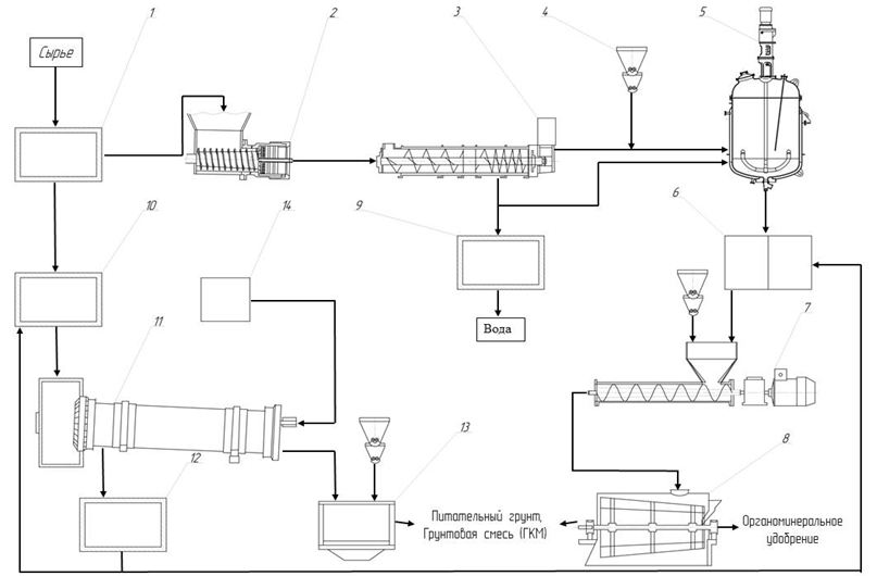 Технологическая схема включает основные блоки и оборудования, которые нужны для ее эффективной работы, предусматривающей получение ценных вторичных ресурсов в виде «кормовой смеси» и «питательного грунта».