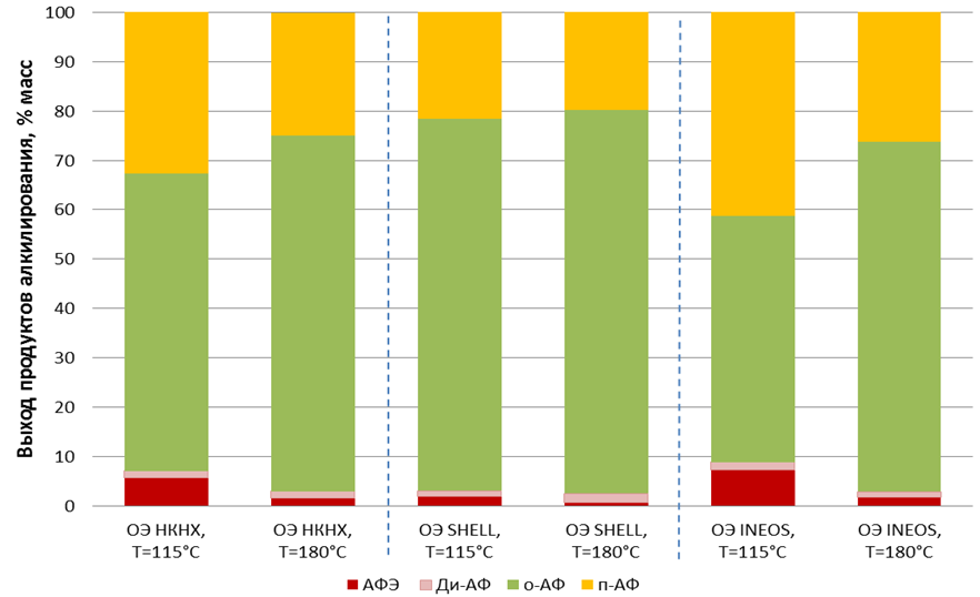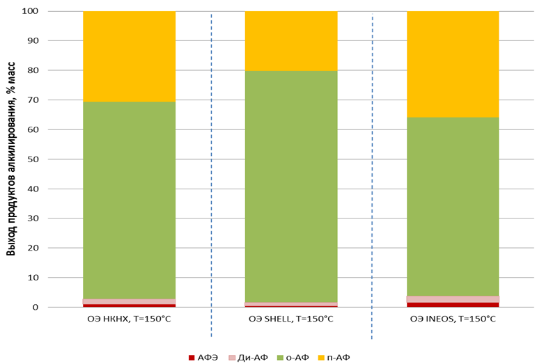 ЦАФ образцов № 16, 17, полученные на олигомерах этилена ПАО «Нижнекамскнефтехим» после 40 и 50 ч работы катализатора соответственно, по химическому составу сопоставимы с ЦАФ, полученным на свежей порции сырья (ЦАФ образец № 2). Выход суммы о-АФ и п-АФ на термообработанном катализаторе составляет 97 % масс., при этом выход побочных продуктов – ди-АФ и АФЭ не превышает 3 % масс., при норме не более 8 % масс.