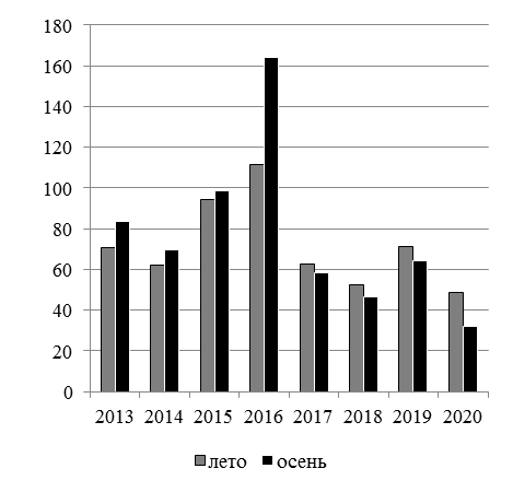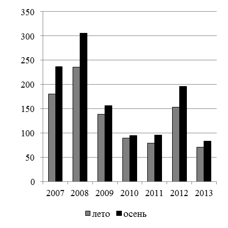 На гистограммах видно, что осенние показатели накопления углеводородов в мышцах воблы чем больше превышают летние показатели того же года наблюдений, тем больше было выявлено углеводородов летом. Так, в 2007–2008 гг. осенний уровень накопления превышал летние показатели соответственно на 41,6 и 51,7 %, а, например, в 2011 г. – только на 32,1 %.