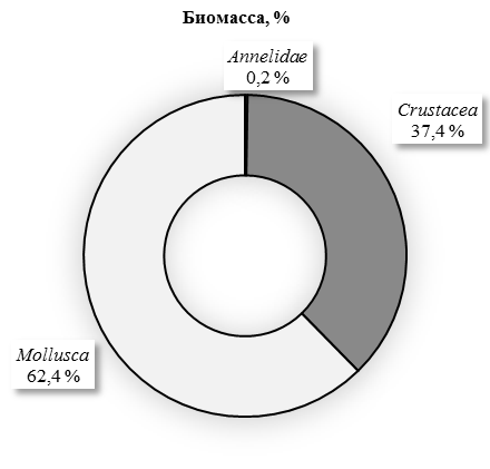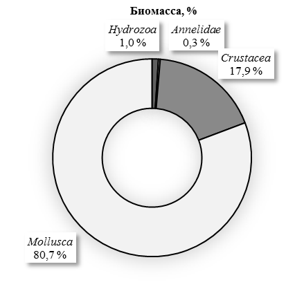 в составе зообентоса в районе установки искусственных рифов: максимально она не превышала 4 и 2 г/м2 соответственно.