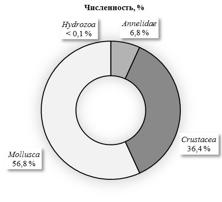 Количественная характеристика зооперифитона. Основу зооперифитона составляли ракообразные и моллюски в оба сезона наблюдений. Летом их доля в общей численности составляла 68 и 28 % и в биомассе – 37 и 62 % соответственно (рис.).