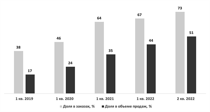 Доля интернет-продаж достигла в 2022 г. 15 % от всей розничной торговли и 30 % от непродовольственной розничной торговли.