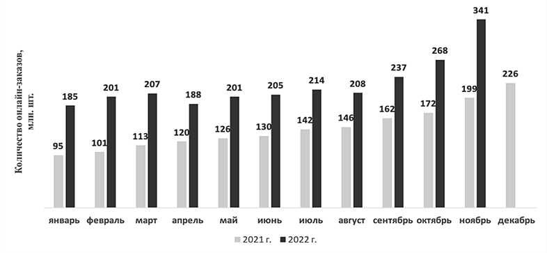 Пандемия коронавируса в 2020 г. придала процессу развития онлайн-торговли новый толчок: ассортимент товаров, представленных в интернете, расширился, сервис процессов заказа и доставки улучшился. Наблюдается постоянный рост количества заказов в интернет-торговле с незначительным замедлением в 2022 г. (рис. 2, 3).