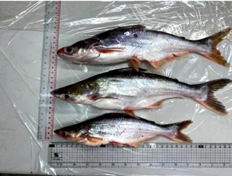 Henicorhynchus lobatus had a body length of 25.0 ± 1.41 cm, where the minimum and maximum values were 24 and 26 cm, while the body weight was 199.0 ± 97.58 g, with min and max values of 130 and 268 g. The fatness coefficient of Henicorhynchus lobatus according to Fulton was 2.32 ± 0.81; according to Clark, 2.18 ± 0.74.