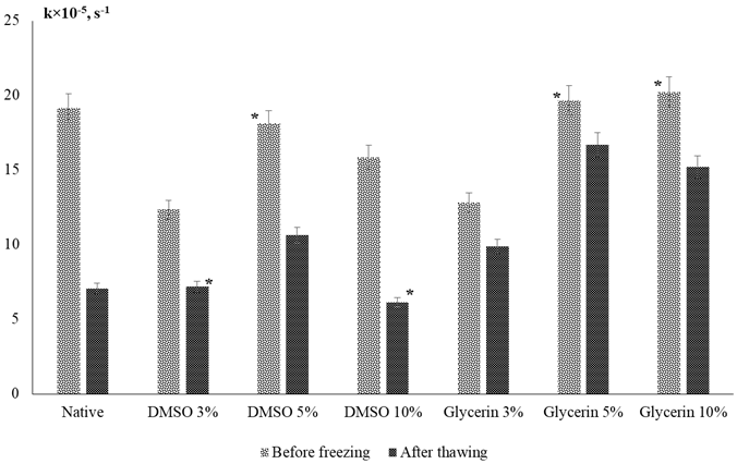 Determination of catalase activity. The activity of the antioxidant enzyme catalase was determined from the rate of H2O2 decomposition. For the study 200 µl of a mixture of sperm and cryomedium (1 : 1) was taken before or after freezing, 800 µl of phosphate buffer (pH 7.4) was added, and the resulting mixture was centrifuged at 3 000 rpm for 10 min. The reaction mixture contained 100 µl of a 30 mM H2O2 solution and 100 µl of the supernatant. The reaction was carried out for 10 min, the concentration of H2O2 was measured using an SF-103 spectrophotometer (λ = 240 nm). For each variant, 3 parallel independent measurements were carried out. On the basis of the obtained spectrophotometric data the kinetic curves of H2O2 consumption were constructed, which were linearized in the coordinates of the first-order equation. The rate constants of the first-order H2O2 decomposition reaction were calculated from the slope of the constructed straight lines.