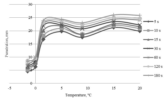 Fig. 1 show data on the change in the penetration depth depending on the time of immersion of the penetrometer cone (from 5 to 180 s) when the temperature of minced carp and silver carp changes from –1.5 to +20 °C.