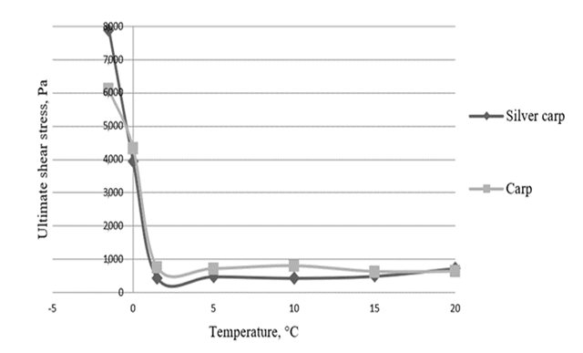 First, dependences of rheological characteristics (ultimate shear stress, penetration depth, effective viscosity, and adhesive ability) of minced aquaculture fish (carp and silver carp) in a temperature range (from –2.5 to +25 °C) have been identified for the first time.