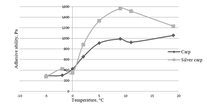 From the data presented in Fig. 3, it can be seen that the adhesive ability of samples of minced carp and silver carp increases with an increase in the temperature from –5 to +19 °C, and in the range from –2 to +4 °C, these changes are most pronounced.