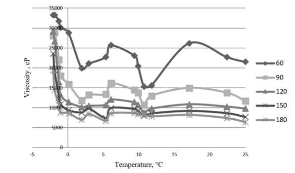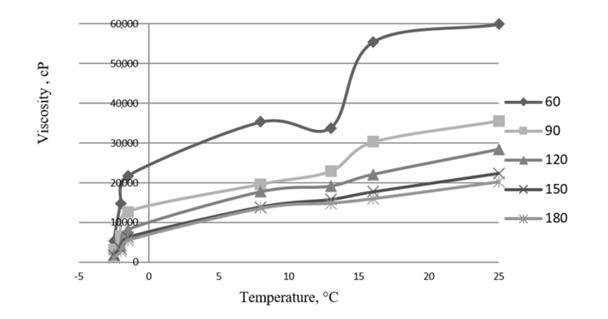Fig. 4 show the experimental data on the change in viscosity (indicated in centipoise, cP) depending on the temperature change of minced carp and silver carp (from –2.5 to +25 °C) with a change in the spindle speed.