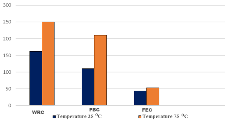 An important property of products is the capacity to bind and retain moisture. This capacity is characterized by a whole range of FTP [21, 30]. Equally important FTPs include properties that make it possible to bind fats, to form foams, gels, fat emulsions. There are a number of methods for determining FTP, such as WRC, FEC, FBC, CGC, FC, FS, and protein’s solubility in water; the methods have been used to determine these characteristics in the “KalmaKS” product. In order to study the effect of temperature on the FTPs, the determination of WRC, FEC and FBC has been carried out at different temperatures of the “KalmaKS” system – the water: 25 ± 2 and 75 ± 2 °C.