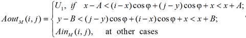 – output parameters of the working zone of IR gripper drawing rectangle figure with vectors i and j; U1 – reflection coefficient of the workpiece; x, y are the coordinates of the position of the centers of the rectangle in rows and columns; A – a side of rectangle along X coordinate at drawing trajectory; B – a side of rectangle along X coordinate at drawing trajectory; j – angle of rotation of the rectangle around the center;