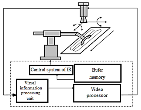 The TVS control unit circuit begins to function when there is a workpiece in the IR fixation zone. After fixing the workpiece, the image sensor transmits video signals to the control computer by means of the video signal input unit, where, after processing information about the state of the objects, the executive commands are transmitted to the IR actuator. To increase the level of illumination of the smooth and oval surface of the workpiece, the image sensor of the TVS is supported by lighting means.