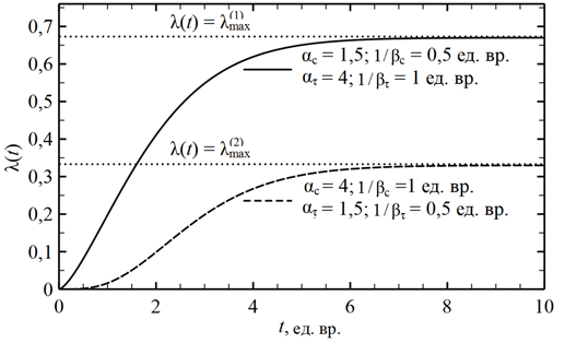 Рис. 1. Рассчитанная по формуле (6) динамика удельного среднего объема продаж λ(t) для двух наборов параметров