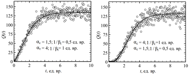 В обоих случаях динамика математического ожидания Q(t) (сплошные линии) была рассчитана по формуле (6)