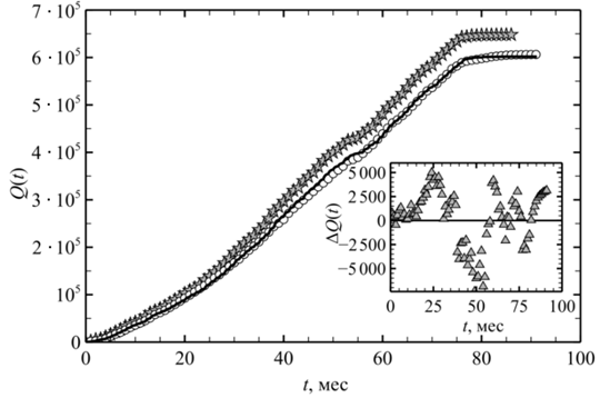 Сплошной линией на рис. 3 показана теоретическая зависимость от времени количества проданных в России автомобилей «Лада Веста», рассчитанная по формуле (21) с набором параметров (22). Очевидно, что теоретическая и эмпирическая зависимости хорошо согласуются друг с другом. Это дополнительно подтверждается вставкой на рис. 3, где изображена динамика разности ∆Q(t) между реальным количеством проданных автомобилей и значением этого количества, рассчитанным с помощью (21), (22). Действительно, эта вставка показывает, что, во-первых, разность ∆Q(t) в любой момент времени намного меньше, чем объем продаж