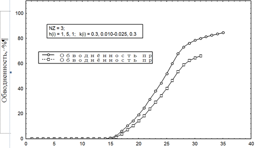 Зависимость обводненности низкопроницаемого пласта от времени для трехслойного пласта