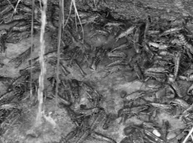 Длительность культивирования в прудах составляла в 2021 г. 89 суток, в 2022 г. 99, 78 и 62 суток соответственно. По окончании эксперимента пруды были полностью спущены с использованием заградительных решеток. Для концентрации раков в пруду оставляли слабую подачу воды. При сборе раков около 50 % особей концентрировалось в районе водоспуска. Оставшиеся раки были собраны около водоподающей трубы и в остальном пространстве ложа пруда. В течение двух последующих суток было собрано еще 10–15 % раков около водоподающей трубы (рис. 2).