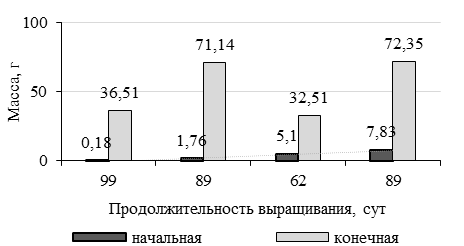 и длительности выращивания 78 сут. Снижение показателей обусловлено не столько более коротким периодом выращивания и более высокой плотностью посадки по сравнению с другой группой с близкой средней массой (0,18 г), сколько большим количеством высшей водной растительности в толще воды, развившейся за время культивирования. Это сказалось в целом на общей ракопродуктивности пруда, которая была ниже в 2 раза, чем в первой группе. Вследствие данного мешающего фактора в эксперименте результаты культивирования данной группы раков для дальнейшего сравнения с другими вариантами не рассматривали.