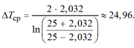 При условии постоянства потока теплоносителя (вода 10 °С = 283 К, нагревающаяся до 15 °С = 288 К) и неизменности его термодинамических свойств ΔТср определяется по формуле (1), где ΔT1 – разность начальных температур рабочей среды (45 °С = = 318 К) и охлаждающей воды (10 °С = 283 К); ΔT2 – разность конечных температур рабочей среды (20 °С =