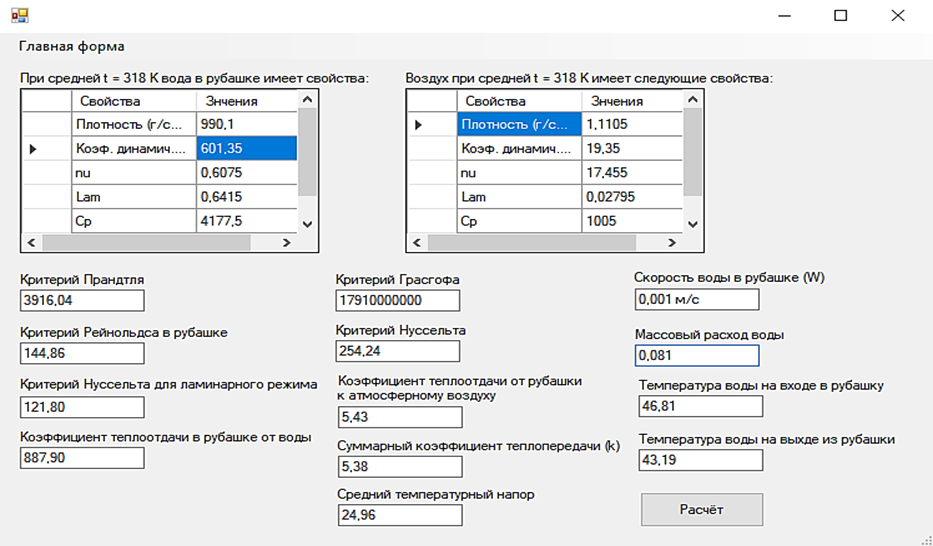 Рис. 3. Интерфейс программы расчета реактора при охлаждении реакционной смеси
