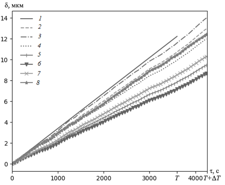 Поиск стабилизирующего управления ΔI реализовывался для постоянных значений ΔT = 641 с, ΔS = 2,37 дм2 и случайных процессов для Δt с математическим ожиданием 1,03 ºC и дисперсией 127,2 ºC2, а также для ΔpH с математическим ожиданием –0,03 и дисперсией 2,15.