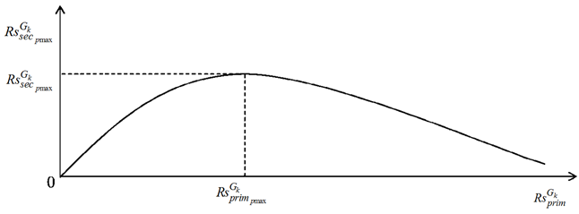 Однако большое число агентов-подчиненных может также повлечь и уменьшение функции (1) за счет чрезмерной нагрузки на вычислительную и коммуникационную подсистемы агента-менеджера (агент-менеджер не сможет оперативно получать и обрабатывать входящие сообщения от агентов-подчиненных, а также генерировать и высылать ответные сообщения). Обозначенная зависимость величины вторичного ресурса от объема первичного ресурса иллюстрируется на рис. 1.