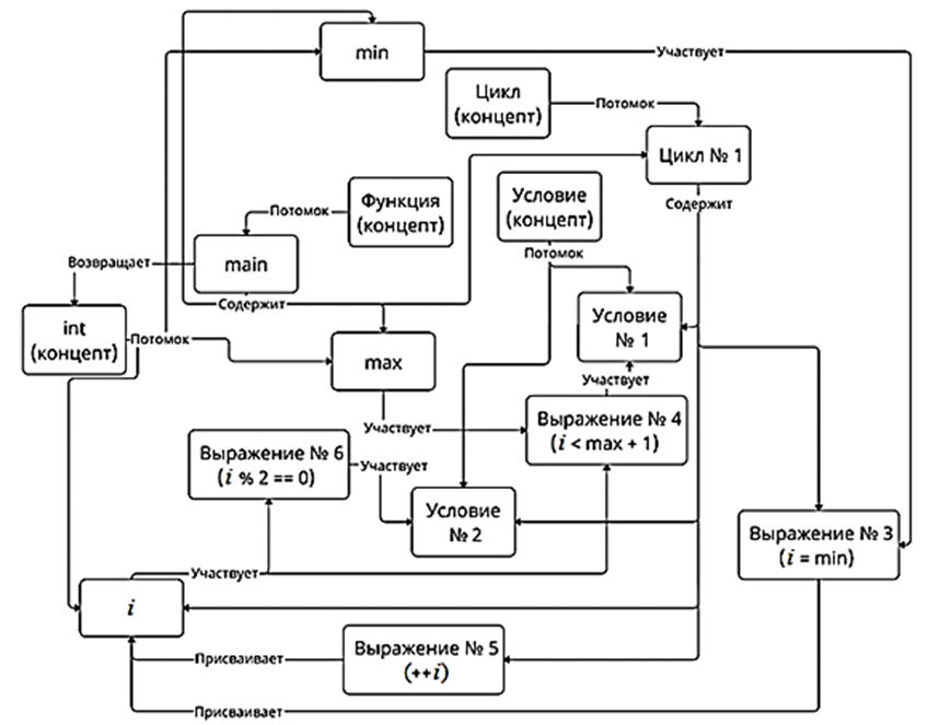 В данной сети присутствуют узлы, являющиеся «концептами» языка, т. е. некоторыми базовыми определениями. Также присутствуют узлы, отображающие цикл, условия и функции как некоторый набор содержащихся в них действий (например, узел main содержит узел min). Сами команды программы представлены в узлах «выражение», каждый из которых связан с теми элементами, которые входят в выражение (например, переменная i входит в выражение ++i), либо на которые оно влияет (например, выражение № 6 i % 2 = 0 предоставляет значение условию № 2).