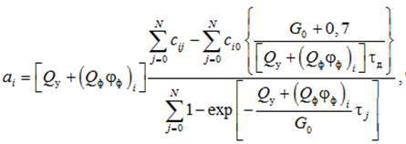 где ci0, ci, ciд – начальная, текущая ко времени t и в доливаемом масле концентрация i-го продукта старения ММ, отн. ед.; аi – скорость старения масла по i-му направлению, г/ч, мг KOH/ч; Qу, Qд, (Qфjф)i – скорость угара (долива) масла и интенсивность его очистки (фильтрования) по i-му компоненту, г/ч, мг KOH/ч; G0 – вместимость СС (масса масла в картере двигателя), г; t – время (период) работы масла (двигателя), ч.