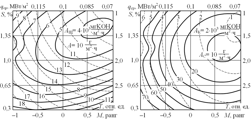 В области S = 1–1,35 % и Т = 1–2 наблюдается рост показателей АЩ и АС по мере повышения qср и снижения величины М, характеризующей эксплуатационные свойства масла. Здесь форсировка двигателя превалирует по отношению к показателю качества ММ в действии на рассматриваемые функции отклика. Подобное явление присуще также направлениям старения масла по А и АС, когда экспоненциальные зависимости по ним указывают на преобладающее влияние qср над М и Т по сравнению с действием М во всем факторном пространстве.
