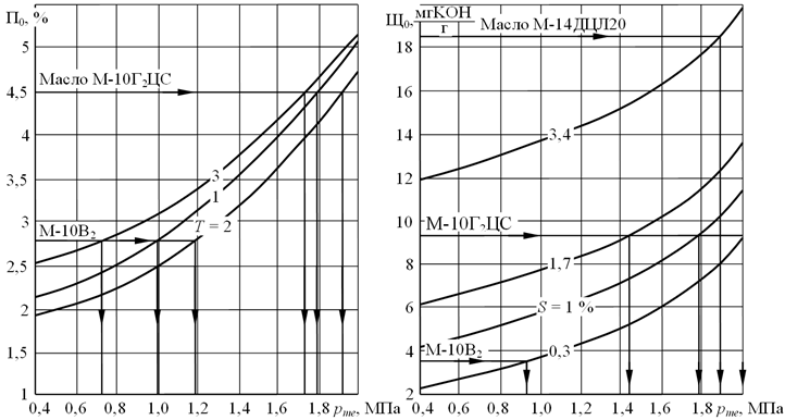 Возможности унифицированных ММ по нейтрализующим свойствам (рис. 2, б), рассчитанные по полученным зависимостям, показывают удовлетворительную работу масла М-10В2 в двигателе с форсировкой по рте до 1 МПа только при работе на малосернистом топливе (S = 0,3 %). Масло М-10Г2ЦС с начальной щелочностью Щ0 = 9,2 мг KOH/г обеспечивает при содержании серы в топливе 1 % эффективную работу дизеля с форсировкой до 1,8 МПа.