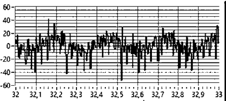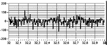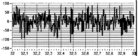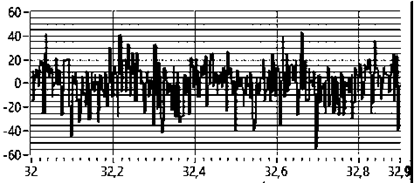 Обработка результатов измерений проводилась в программном продукте NILabview. Замеры производились поминутно на различных частотах вращения. По оси Х представлено время, для стандартизации на рисунках представлен временной диапазон в 1 с (между 32-й и 33-й секундой замеров) на различных частотах вращения вала. По оси Y представлено ускорение. Для удобства графики смещены относительно среднего значения к оси Х, величина смещения указана в подписях к рисункам, представленным ниже.