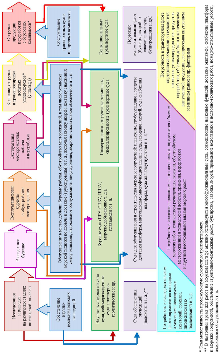 Развитие нефте- и газодобычи сопровождается развитием сопутствующей транспортной инфраструктуры, в том числе морской. Практически все проекты расположены в западной части Арктики, это обусловлено несколькими причинами, ключевые из которых – недостаточная изученность шельфа морей Восточной Арктики и отсутствие инфраструктуры. Большинство планов и идей по добыче углеводородов в этой части Арктики, в отличие от западных проектов, рассматриваются к реализации за пределами 2030 г. Перспективы развития перевозок подразумевают рост спроса на флот и вспомогательную технику в этом регионе. Высокая капиталоемкость отрасли требует верификации прогнозов и детализованных оценок потребности во флоте.