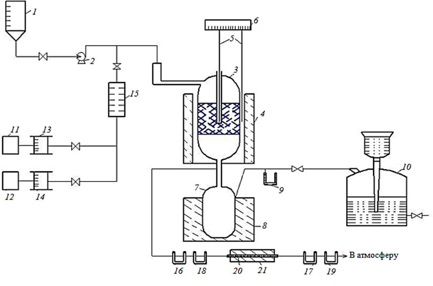 Закоксованный катализатор регенерировался в течение 2 ч при температуре 550 °С в токе предварительно осушенного с помощью хлористого кальция и цеолита NaХ воздуха, который подавался в реактор из баллона 14 со скоростью 1,0 л/ч, устанавливаемой редуктором 15 и ротаметром 16. Продукты регенерации из реактора проходили через последовательно расположенные поглотительные трубки 20, заполненные хлористым кальцием и аскаритом, далее поступали в печь дожига 21, где происходило окисление СО в СО2. Окись меди