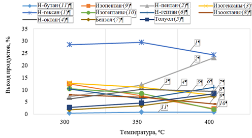 Выход продуктов превращения пропан-бутановой фракции при температуре 300–400 °С