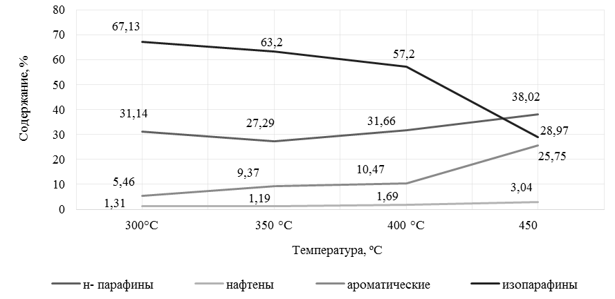 Изменение состава при 250–400 °С связано с интенсивным течением деструктивной изомеризации. Содержание изопарафинов при 300–350 °С достигает 57,32 % масс.
