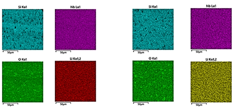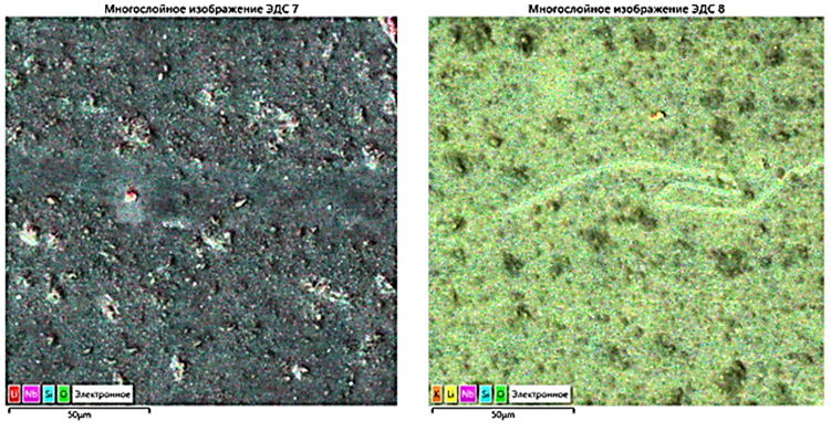 После изучения полученных снимков поверхности образца был проведен энергодисперсионный анализ для изучения элементного состава образца, проверка наличия или отсутствия посторонних химических элементов в составе материала. Также энергодисперсионный анализ позволил различить, где больше накоплено того или иного химического элемента на пленке для дальнейшего изучения. Полученные снимки производились с помощью дополнительного модуля – рентгенофлуоресцентного анализатора на электронном микроскопе. Данный модуль регистрирует рентгеновские излучения возбужденных атомов вследствие воздействия на них электронным пучком с пушки микроскопа. Он сопоставляет данные с уже существующим стандартном ka- и kb-излучений химических элементов при таком воздействии и составляет карту распределения зарегистрированных датчиком импульсов: чем выше интенсивность излучения в определенной зоне, тем ярче оно изображено на карте распределения (рис. 2).