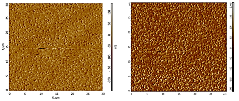 На рис. 4 более наглядно видна разница между образцами, при использовании одинаковых параметров топология поверхности имеет большое количество различий: образец № 1 имеет более равномерную структуру, образец № 2 демонстрирует большое количество различных образований.