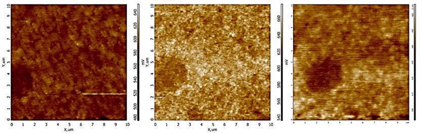 Зонд использовался с такими же характеристиками, как и в предыдущем исследовании методикой зонда Кельвина, параметры остались неизменными, однако область сканирования была выбрана другая, с большим объектом для более наглядного эффекта температурного расширения материала, расположения зонда и места сканирования оставались неизменными. На рис. 9 представлены сканы поверхностного материала при описанных ранее параметрах температуры, напряжение электрического заряда зонда составляет 10 В.