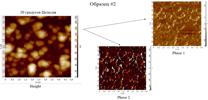 а ‒ at 20°C; б ‒ at 50°C; в ‒ at 75°C; Height – surface morphology; Phase 1 – lateral deformities; Phase 2 – vector deformations