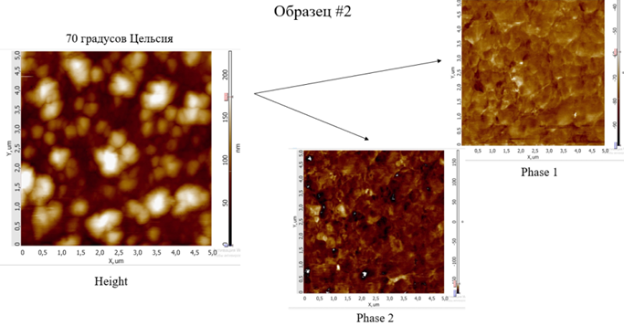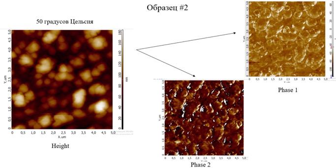 а ‒ при 20 °С; б ‒ при 50 °С; в ‒ при 75 °С; Height – морфология поверхности; Phase 1 – латеральные деформации; Phase 2 – векторные деформации