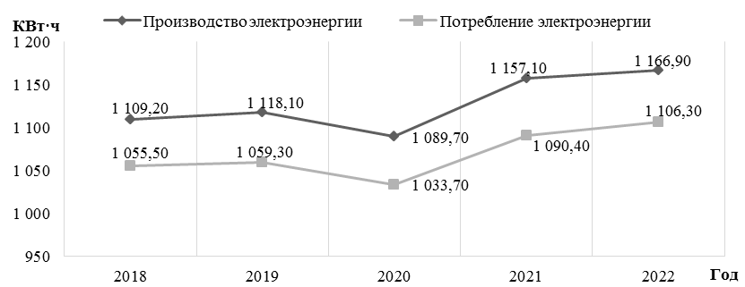 Fig. 1. Dynamics of electricity production and consumption in Russia (2018-2022)